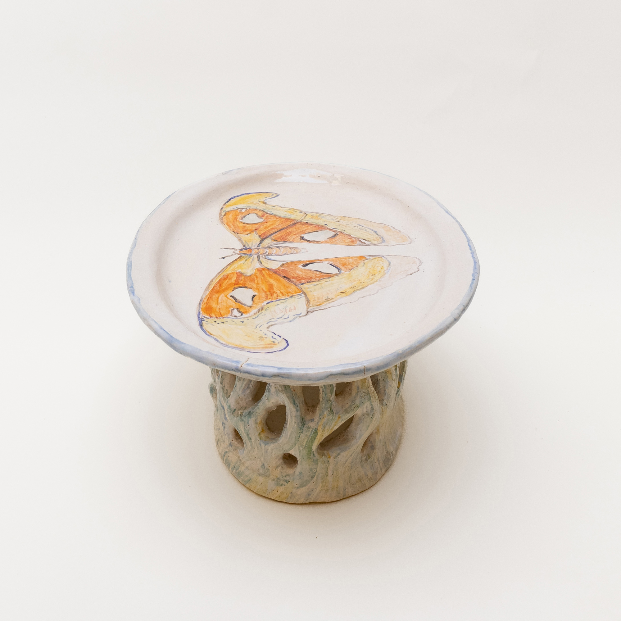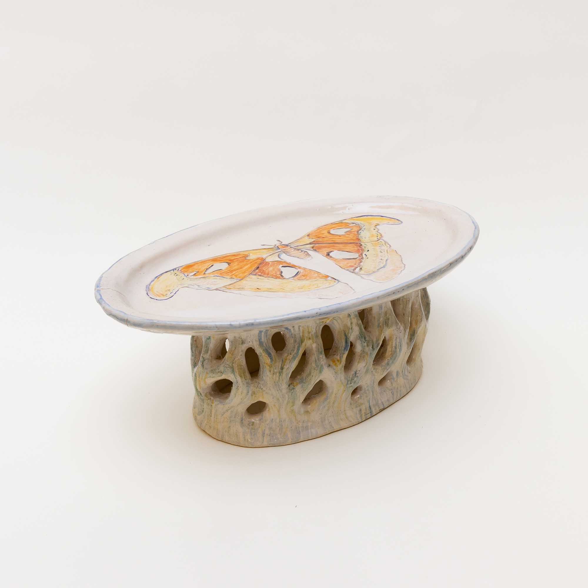 The Hunchback Society is a collective of two artists based in Portugal who develop work in ceramics, Madalena Parreira and Jorge Nesbitt. Their current series features animal and plant elements and is made of stoneware often painted in high fire colors on glaze.
