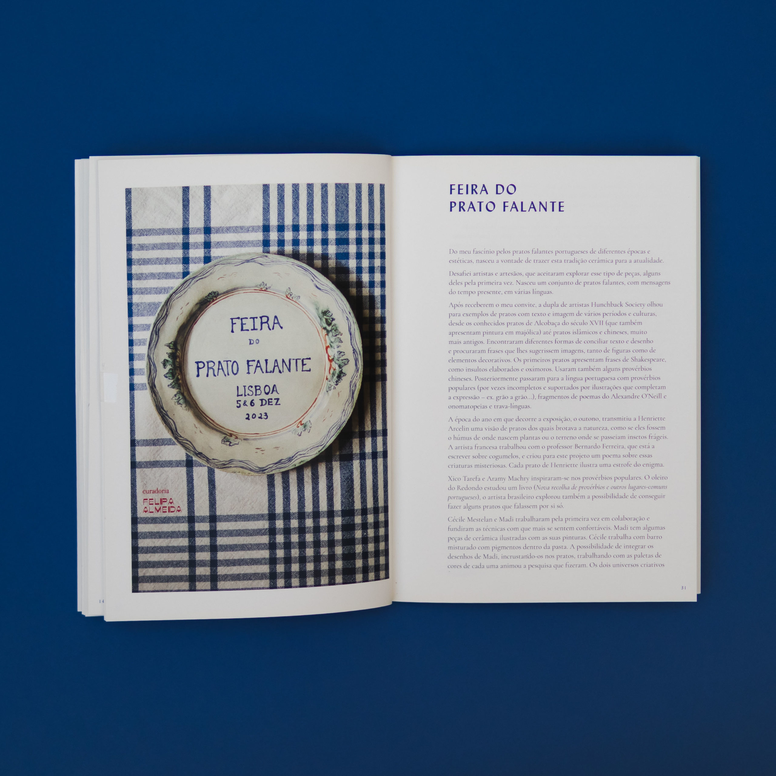 Com a Feira do Prato Falante, surgiu a oportunidade de colaborar pela primeira vez com a antropóloga Maria Manuela Restivo numa publicação conjunta. Ela investigou a produção histórica e reunimos alguns exemplares de pratos antigos, a par das criações resultantes desta exposição.