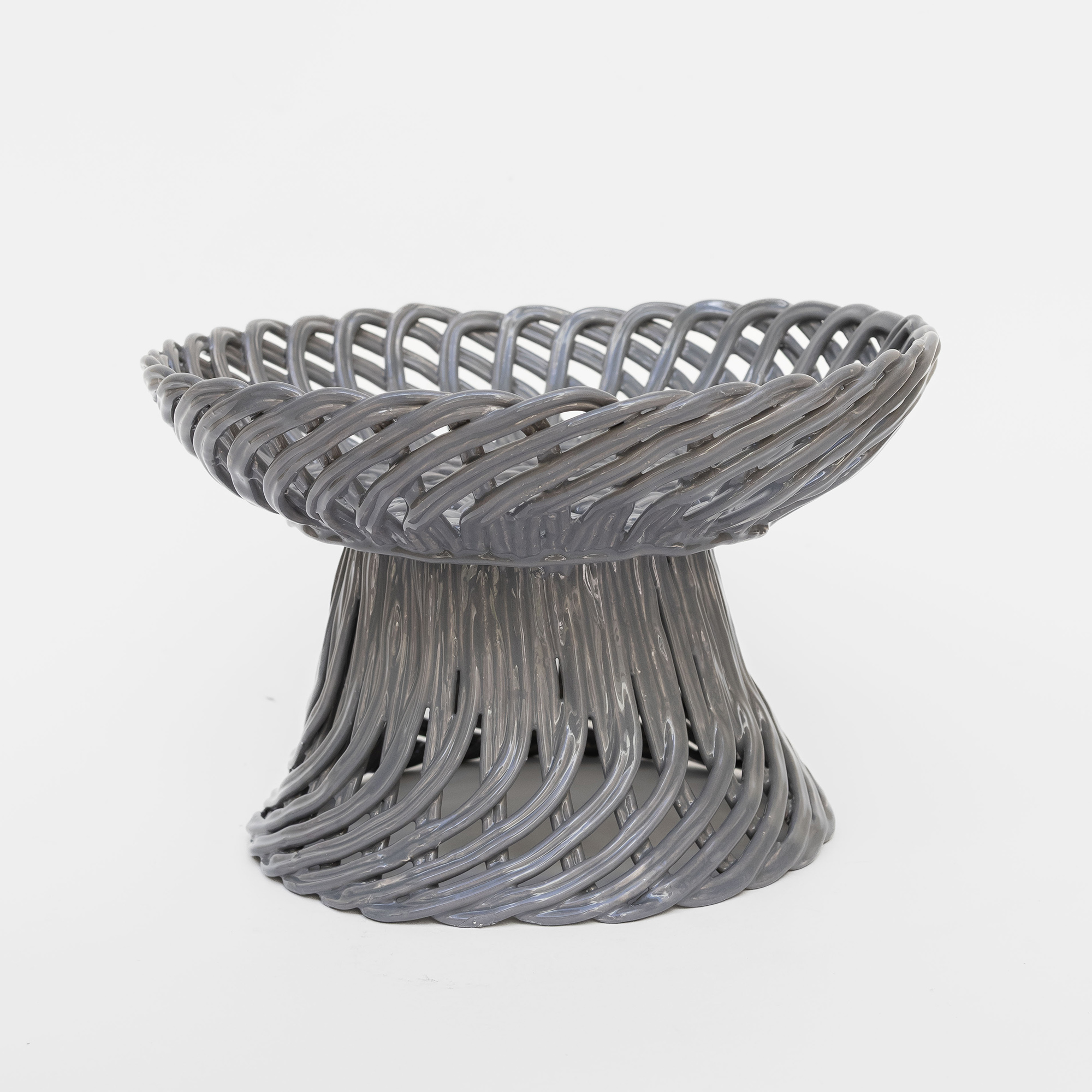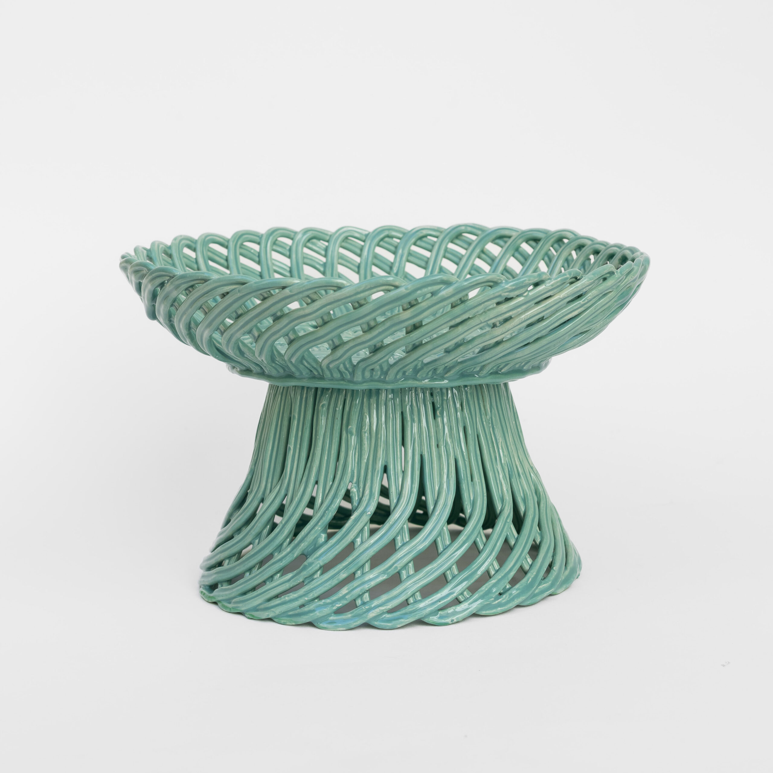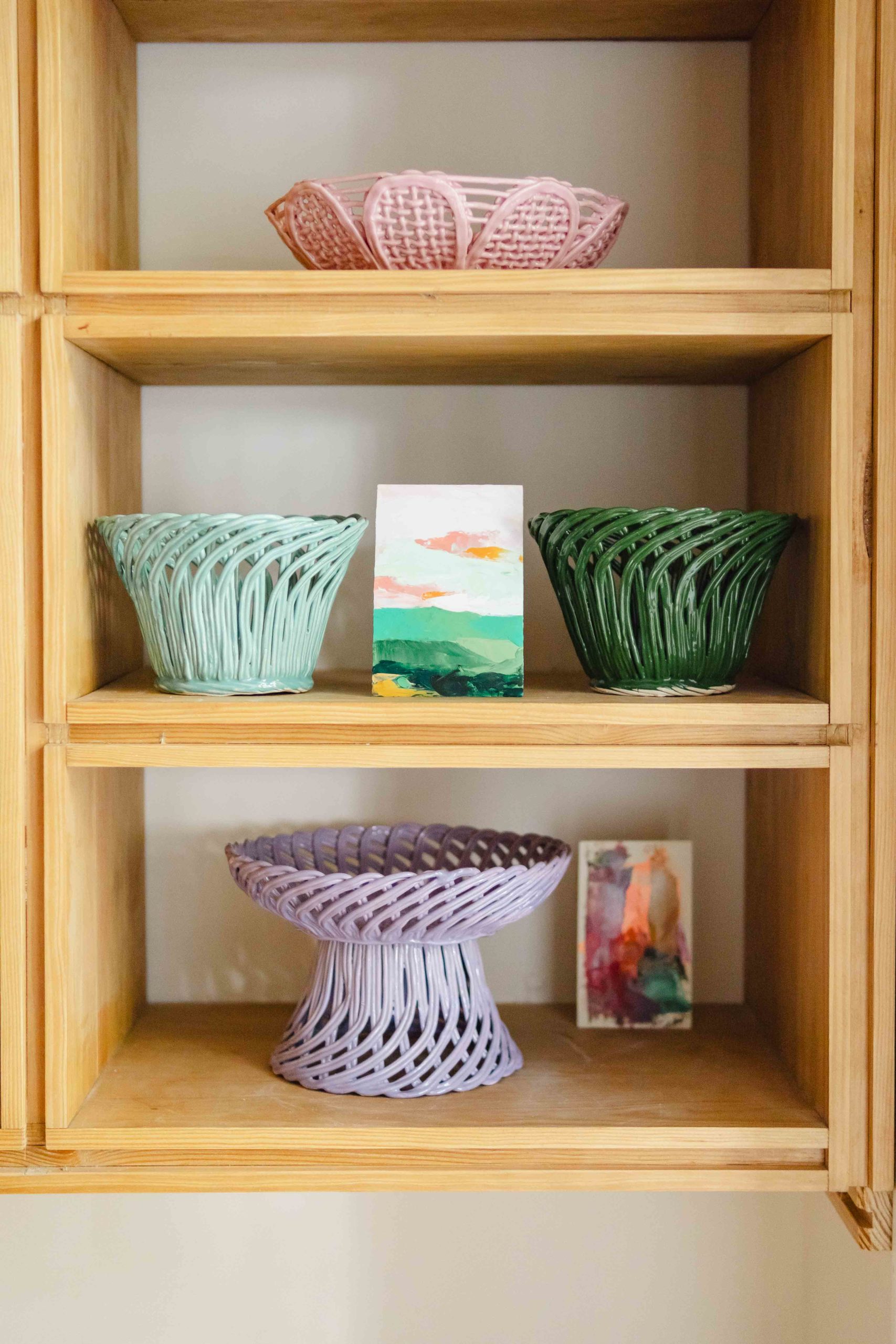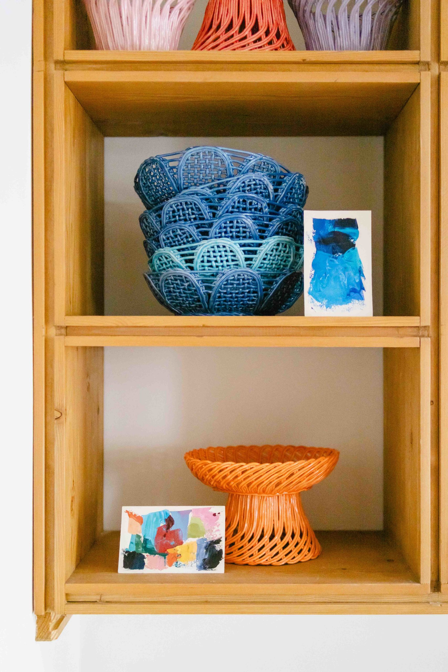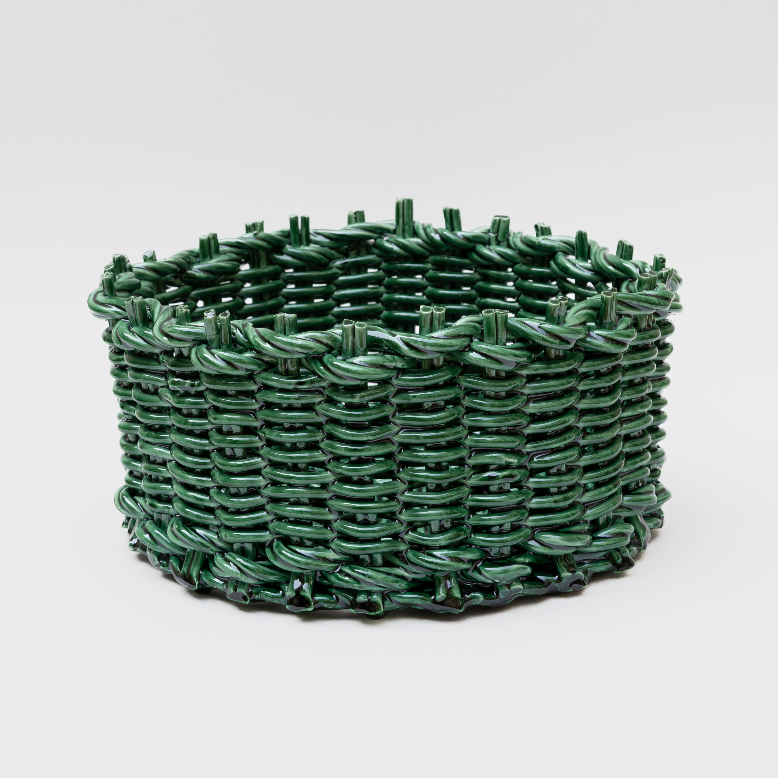 Cestas de cerâmica comissionadas por Felipa Almeida na técnica da verguinha que consiste em produzir a peça com rolinhos de barro entrelaçados, que depois são vidrados.