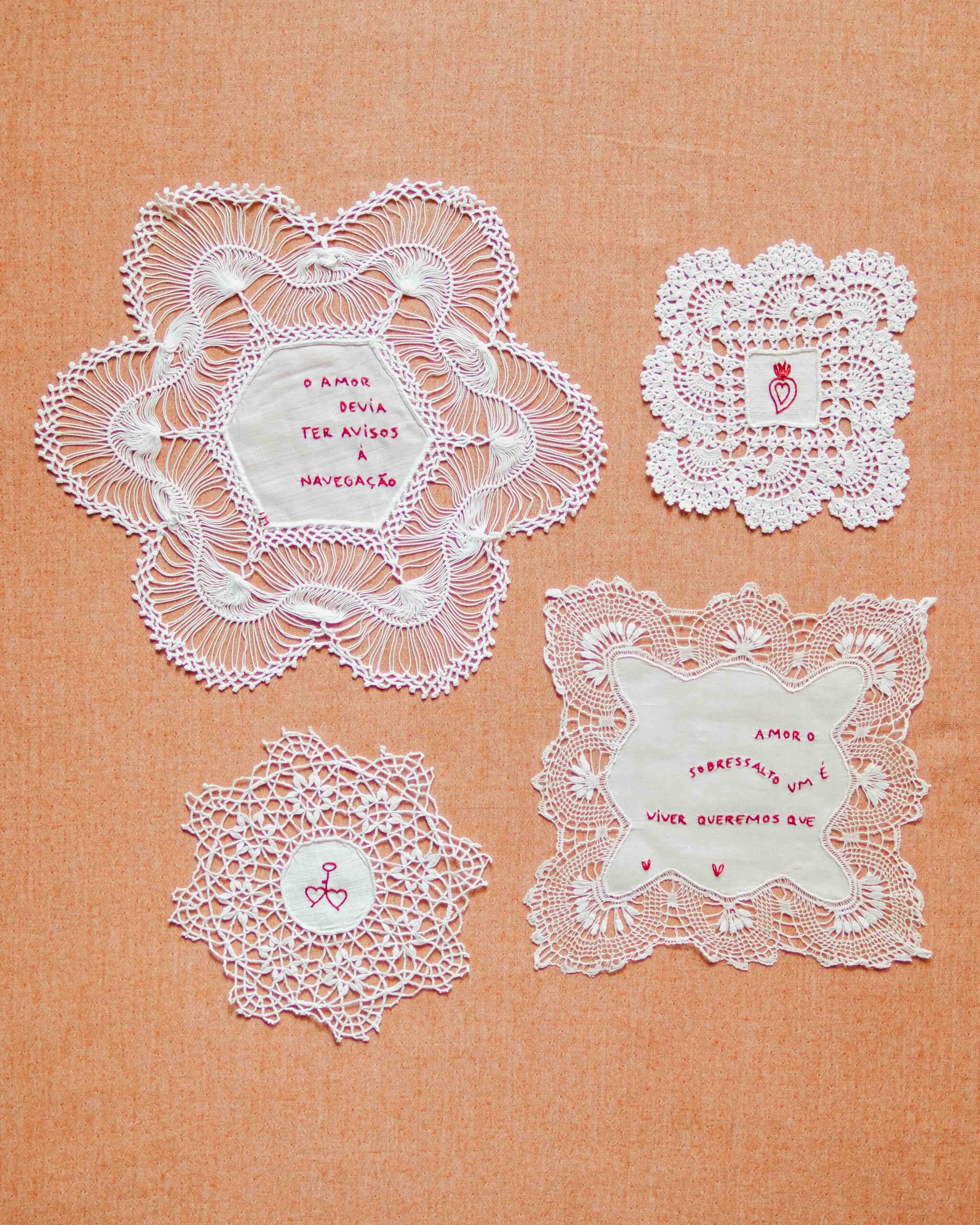 O desejo de reinterpretar a tradição dos lenços de namorados materializou-se no convite feito à Inês Meneses – cuja escrita sobre o amor é tão generosa – para que selecionasse vinte frases suas. Divididas em dois grupos, essas palavras ganharam nova vida: as mais lúdicas foram entregues à Odisseia, que as bordou livremente em panos de linho; as mais românticas foram confiadas a Isabel Lara, que as bordou em panos antigos da sua própria colecção.
